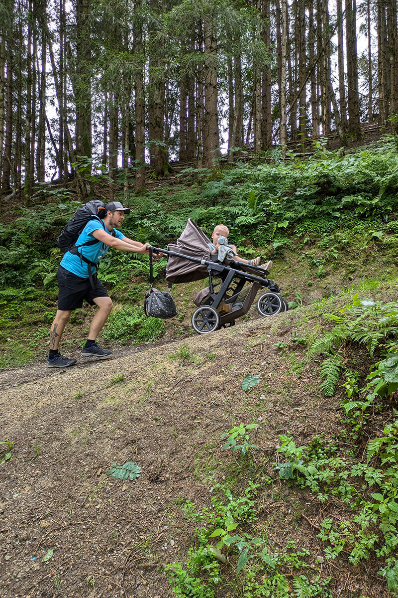 Měli jsme s sebou kočár, že to zvládneme až nahoru. Bohužel asi po prvním kilometru jsme ho museli zaparkovat u lavičky a zbytek dát bez něho. Úzký úsek s kořeny byl poměrně krátký, ale přišlo nám zbytečné se takhle trápit. Sebouš to nakonec bez kočáru zvládl perfektně.