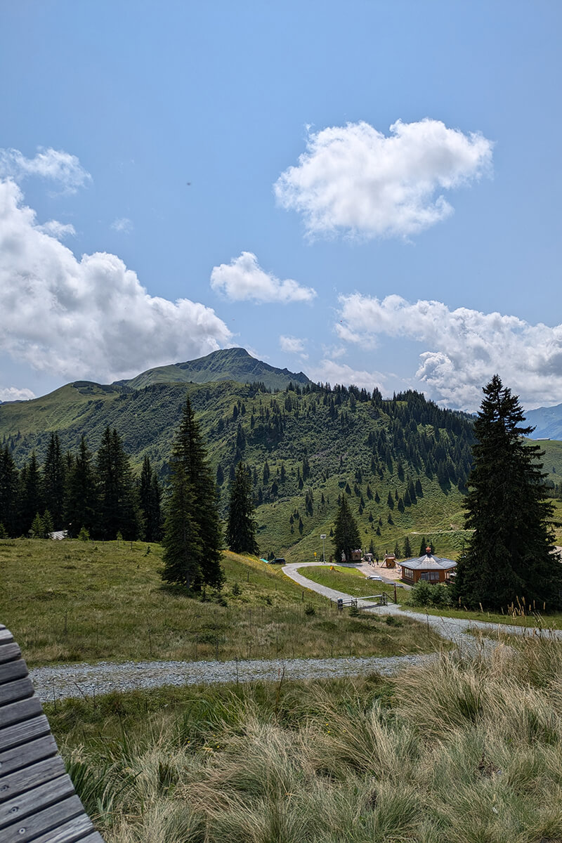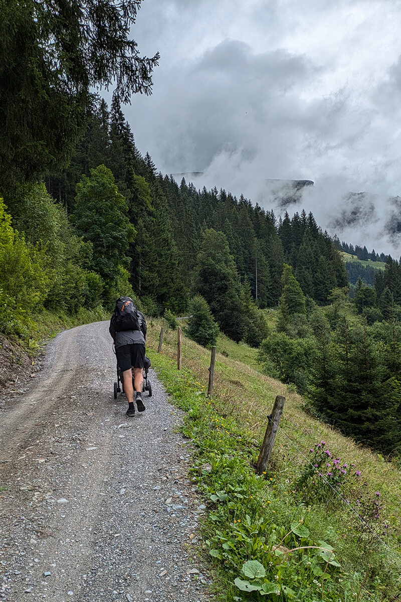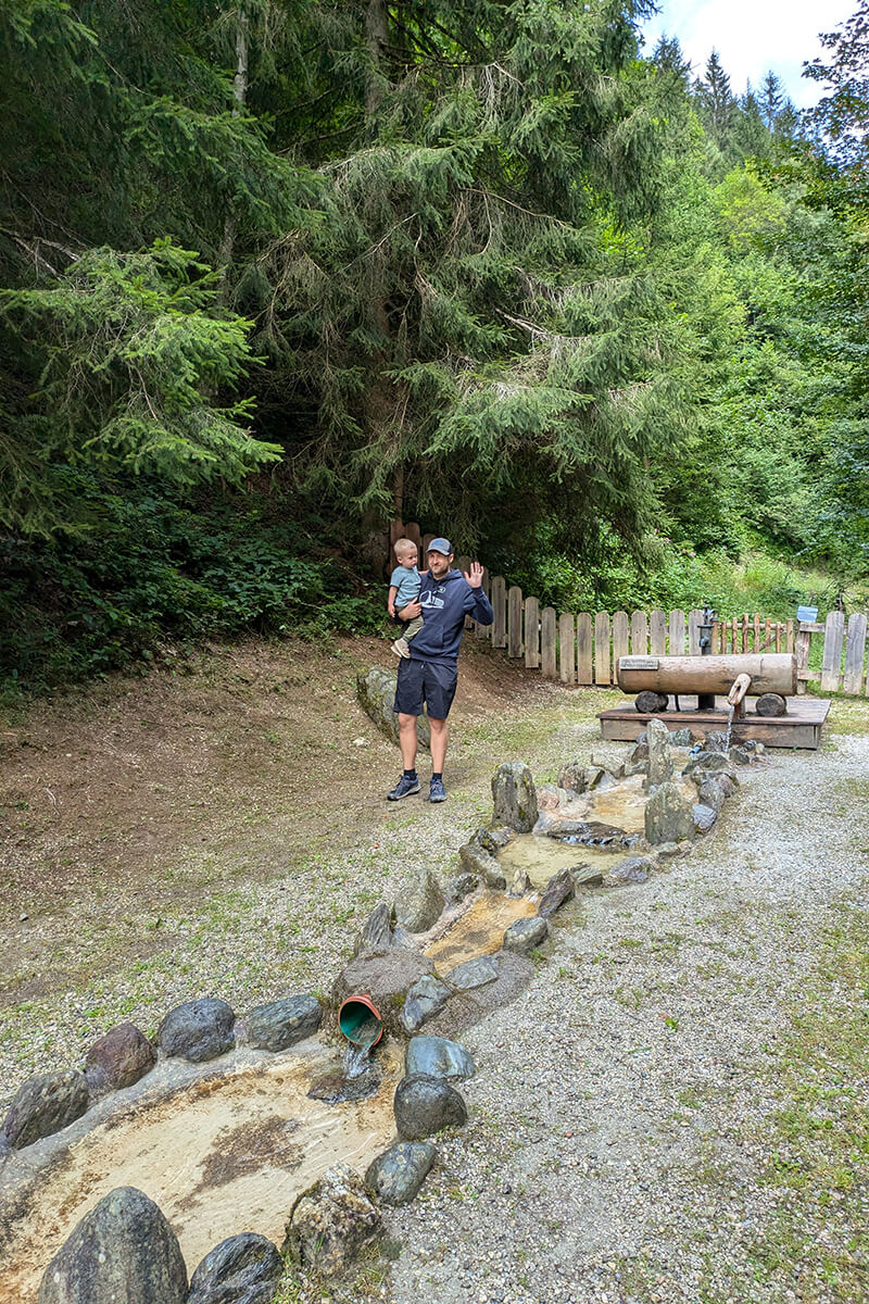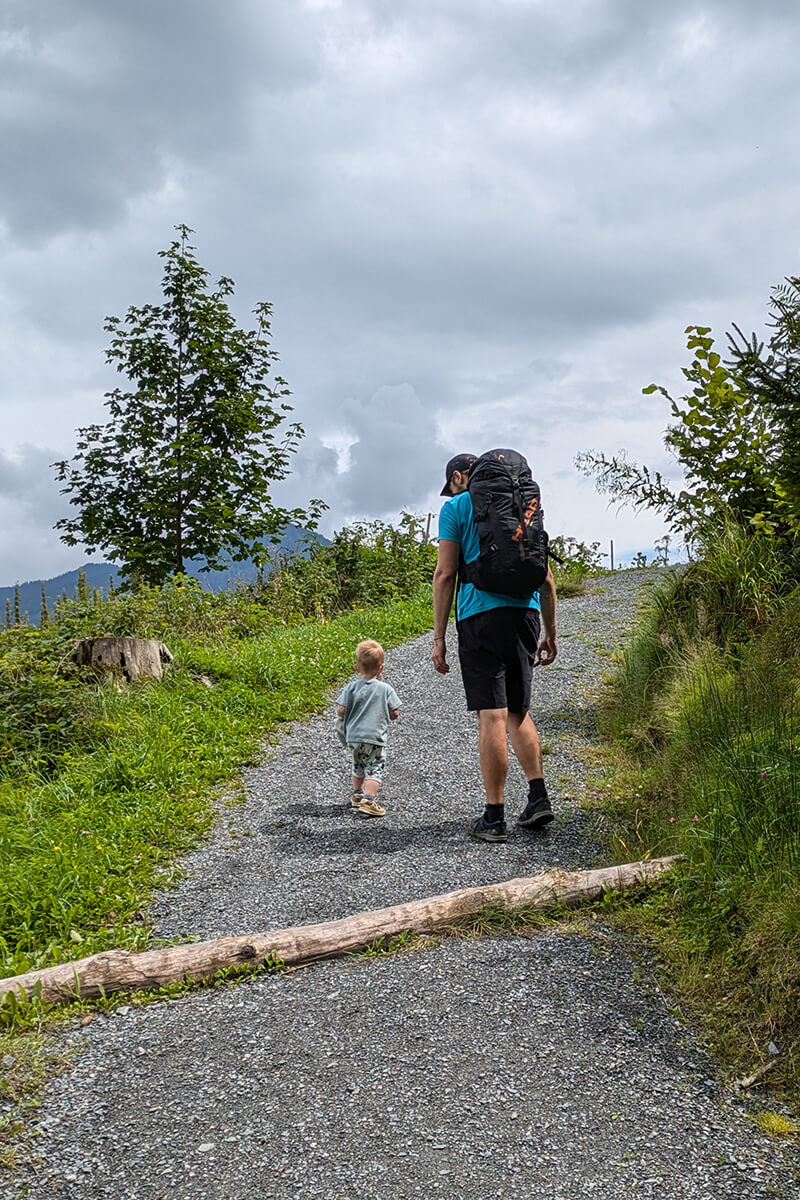 Jen co jsme dojeli, tak začalo pršet a tak jsme se schovali pod střechu u lanovky. Náš plán je vyrazit po trase Arnoweg (Pinzgauer Grasberge) k vodní ploše, kde se nachází dětské hřiště s vodními prvky.